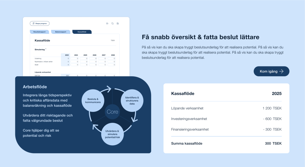 För att fatta rätt beslut idag vill du förstå och testa beslutets konsekvenser på balansräkning och kassaflöde imorgon. Core guidar dig i att samla den data, affärsmässig och annan, du behöver för att möjliggöra förståelse för framtiden.